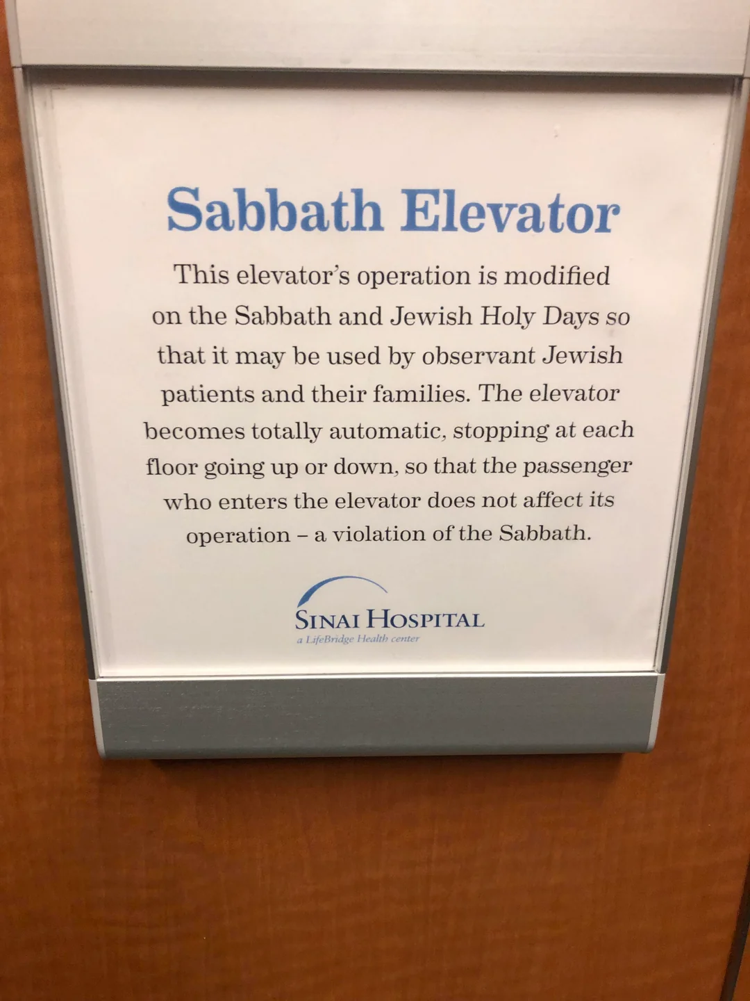 Even today in a strictly Jewish building such as a hotel or hospital you might find the elevators stop automatically at every floor on the Sabbath. This means you do not press the button to choose the floor you want.